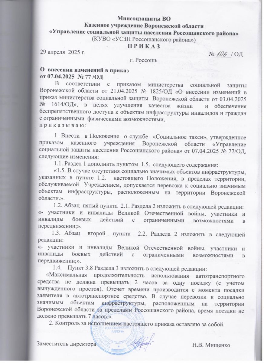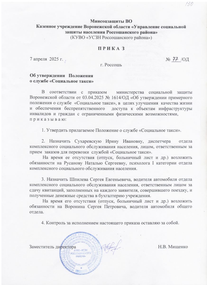 28. Приказ «Об утверждении положения о службе «Социальное такси» КУВО «УСЗН Россошанского района» от 07.04.2025 № 77/ОД (Скачать)