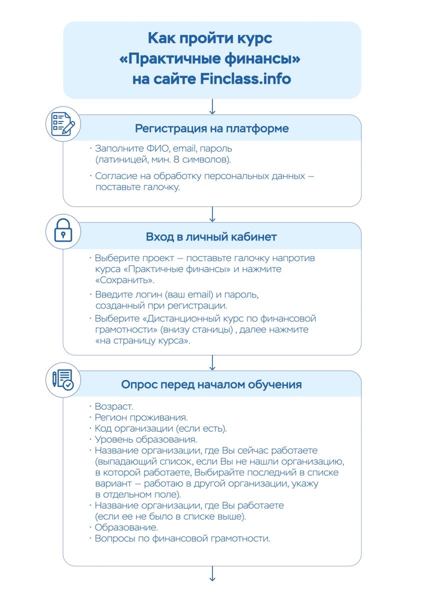 Курс включает в себя девять учебных модулей по основным финансовым тематикам и ориентирован на взрослое экономически активное население независимо от уровня подготовки. Вы узнаете как пользоваться налоговыми вычетами, научитесь управлять личными финансами и грамотно подходить к выбору кредитных инструментов, спланируете дополнительное пенсионное обеспечение и многое другое.